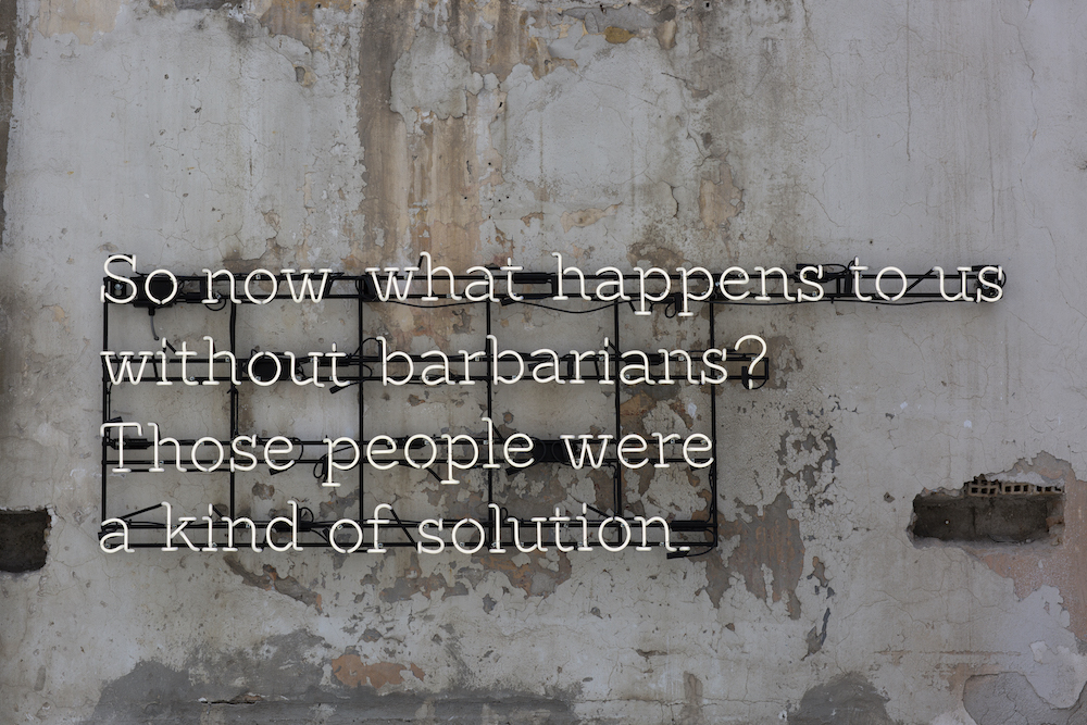 Glenn Ligon is best known for his text-based works, which draw on the words of seminal writers such as Zora Neale Hurston and James Baldwin to explore the complexities of American history and the construction of racial identities. Many are featured in this exhibition at the Fitzwilliam in Cambridge, which looks at the last 35 years of Ligon’s career (20 September–2 March 2025). Curated in collaboration with the artist, the show sprawls throughout the Fitzwilliam, responding to its permanent collection; in the Upper Marlay galleries, for example, Ligon has paired one of his drawings, Untitled (Study for Negro Sunshine), with the Fitzwilliam’s Adoration of the Kings (c. 1520). Ligon’s neon works are also a focal point of the exhibition; the nine-part neon light installation Waiting for the Barbarians (2021), making its first appearance in the UK, is situated in the portico of the museum.